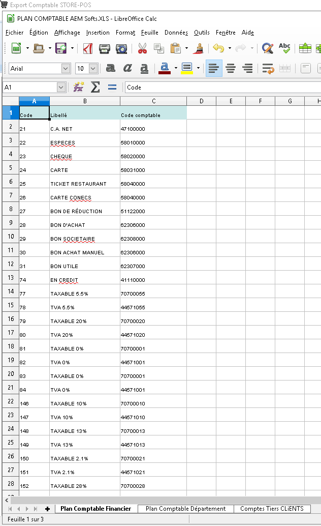 Il vous créé un fichier PLAN COMPTABLE AEMSOFTS.xls sur le bureau de Windows. Il suffira que le comptable remplisse la colonne Code comptable des 3 onglets : Plan comptable Financier, Plan comptable Département et Comptes Tiers CLIENTS.