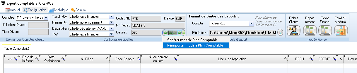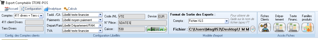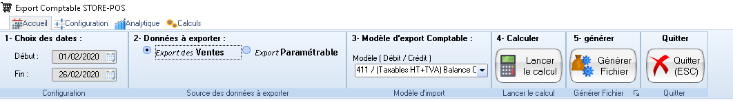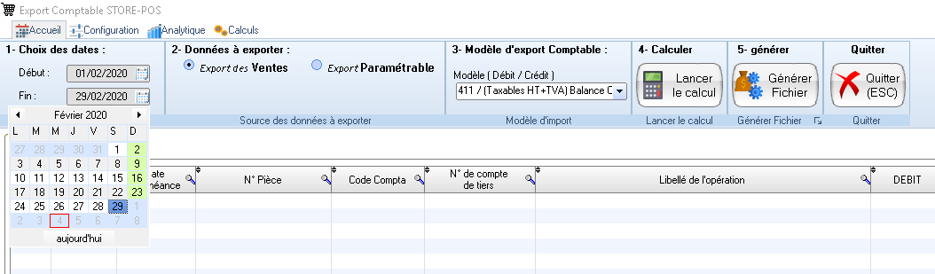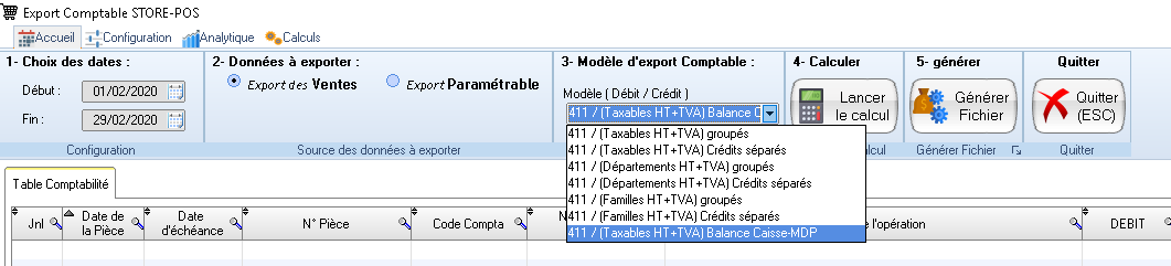 - Le format de sortie ( disponible : Fichier xls, SAGE Compta,EBP compta, CEGID)