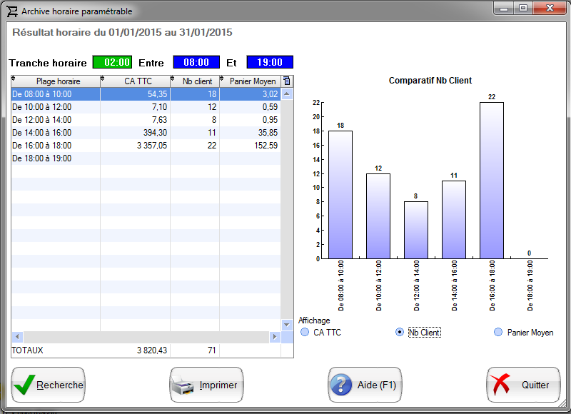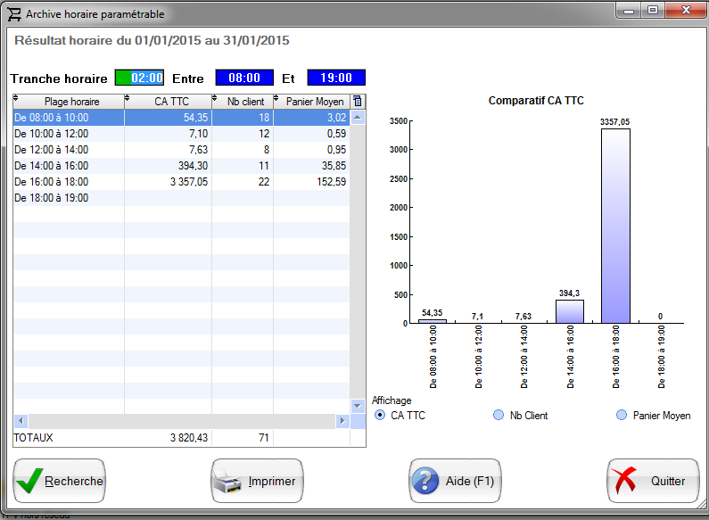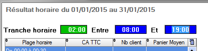 Dans l'exemple ci dessous il s'agit de consulter la répartition du CA pour le mois de janvier 2015 par tranche de 2 heures entre 8H et 19H.
