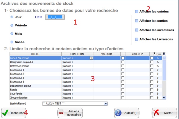 Une fois la validation effectuée un tableau s’affiche. C’est le résultat de votre recherche. C’est a cet endroit que vous retrouvez les informations recherchées avec votre légende pour le type de résultat (entrées, sorties, …)