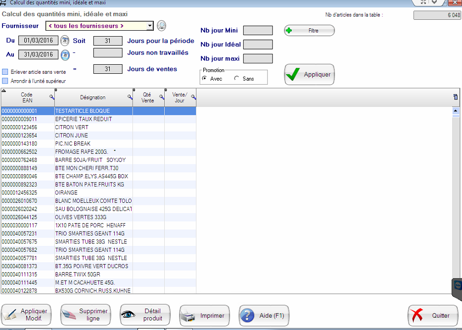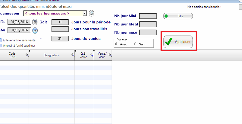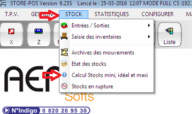 1: Aller dans STOCK puis calcul des stocks mini , idéal et maxi.