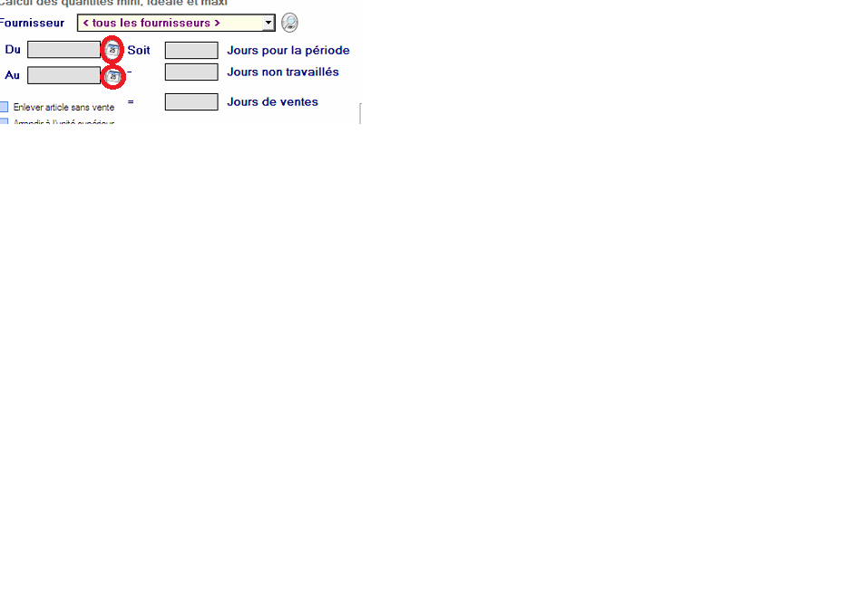 2: choisir une date dans les deux petits calendriers et un fournisseur.