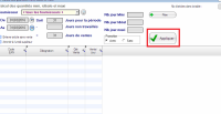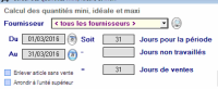1: Aller dans STOCK puis calcul des stocks mini , idéal et maxi. 2: choisir une date dans les deux petits calendriers et un fournisseur. 3: Appliquer les paramètres de recherche. 4: Les recherches apparaissent.