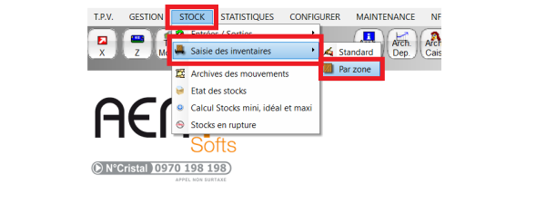 pour faire un inventaire par zone, c'est a dire un inventaire partielle, commencez par cliqué sur STOCK=⇒SAISIE DES INVENTAIRE=⇒PAR ZONE