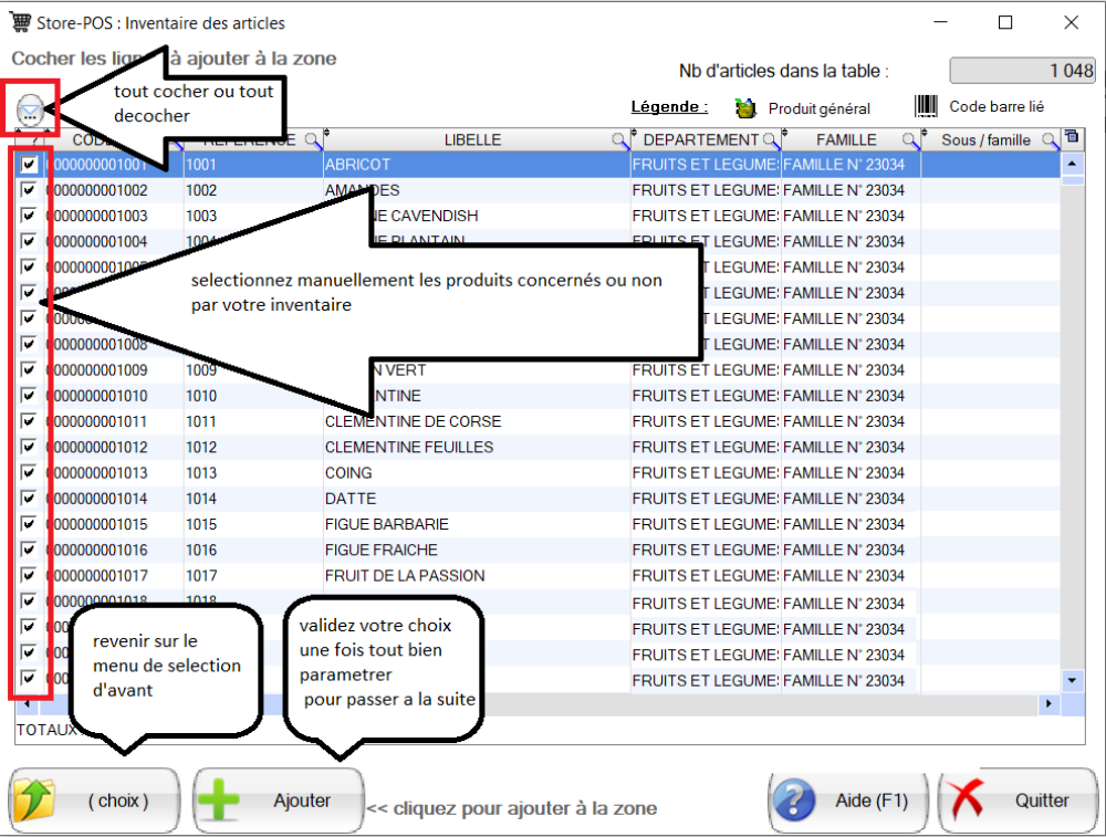 Pour faire un inventaire par zone c'est a dire seulement pour un groupe,une famille ou un certain “type” de produits commencez par cliqué sur STOCK=⇒SAISIE DES INVENTAIRE=⇒PAR ZONE