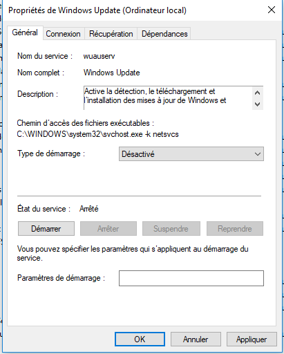 -Allez dans les services, et arrêter “Windows Update”, puis le modifier pour le mettre “Désactivé”