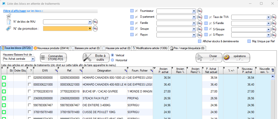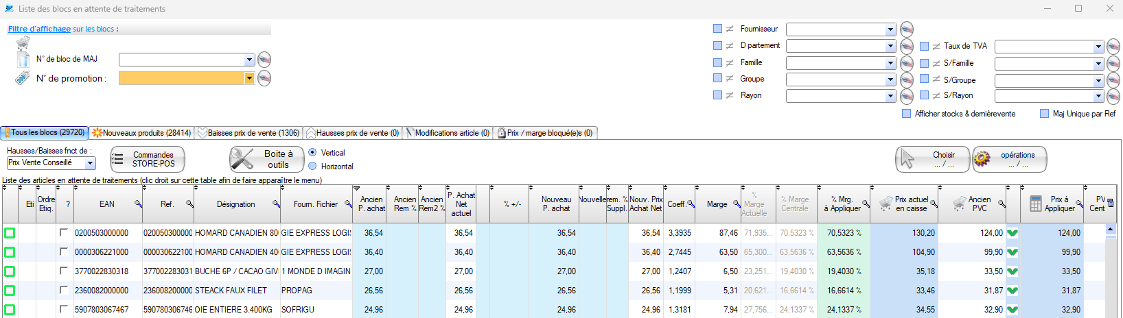 Les produits de la MAJ sont listés et classés dans des onglets : hausses, baisses, nouveautés, modifications, prix/marge bloqués soit en fonction du Prix Vente (PV) soit en fonction du Prix Achat (PA).