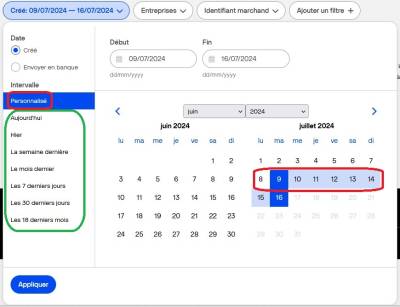 -Le menu de gauche vous propose des créneaux prédéfinis (en vert) ou de personnaliser votre plage de recherche (en rouge) sur le petit calendrier visuel.