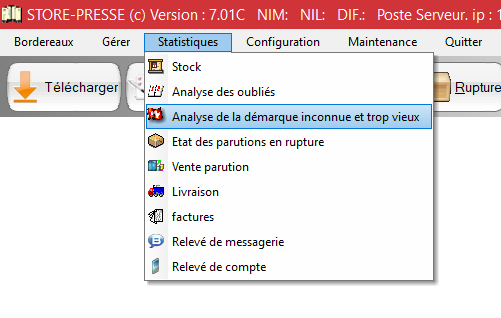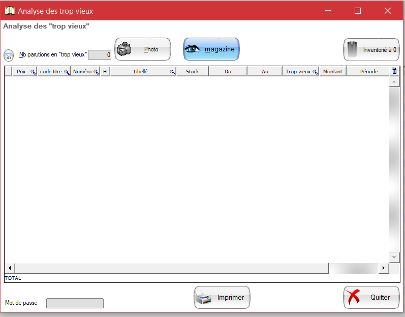 Dans ce menu, vous allez retrouver toutes les parutions qui ont dépassé la date de renvoi, du coup ils ne sont plus en vente et il faut les inventorier à zéro des stocks.