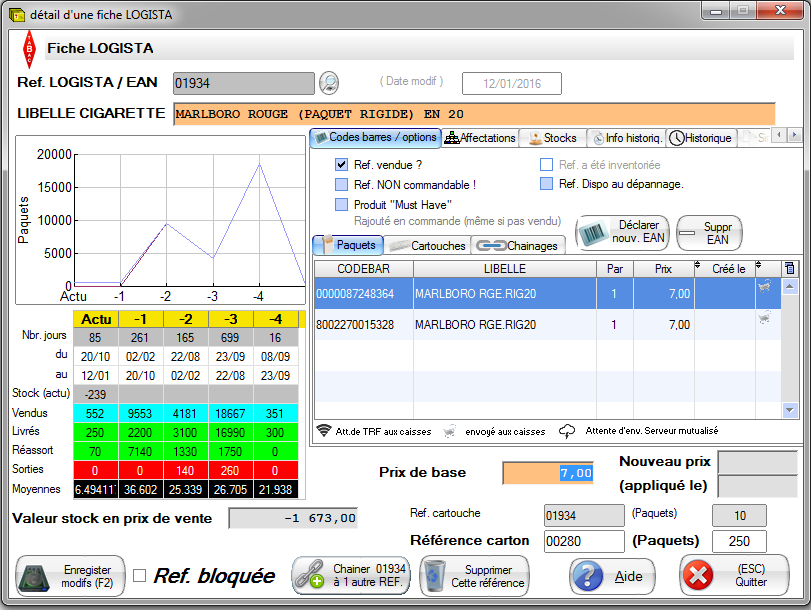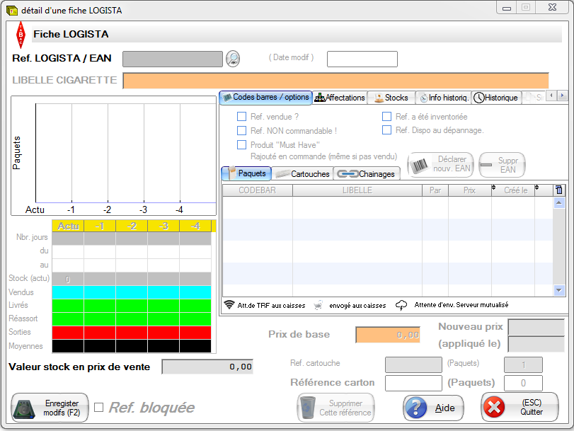 Remarque: vous pouvez utiliser le flag “ref bloquée” pour que cette fiche ne soit jamais mise à jour par Logista. (Par exemple pour que la désignation ne change pas en fonction du catalogue Logista).