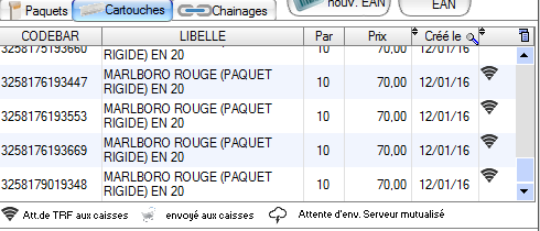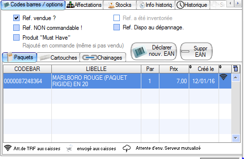 Vous avez également à disposition la liste des codes barres paquet et code barre cartouche enregistrés pour ce produit.