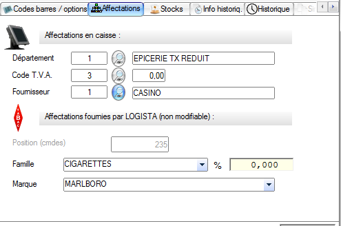 Dans cet onglet vous trouverez les informations de rattachement à la structure IFLS et fournisseur. vous avez également les informations descendant de Logista concernant la famille, la marque et le positionnement dans la commande. le pourcentage (taux de marge) est défini par la famille. (vous devez donc configurer vos familles dans le logicielavec les bons taux)