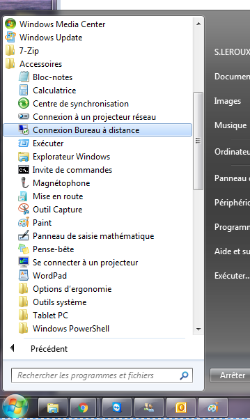 Démarer/Tous les programmes/accessoires/connexion bureau à distance