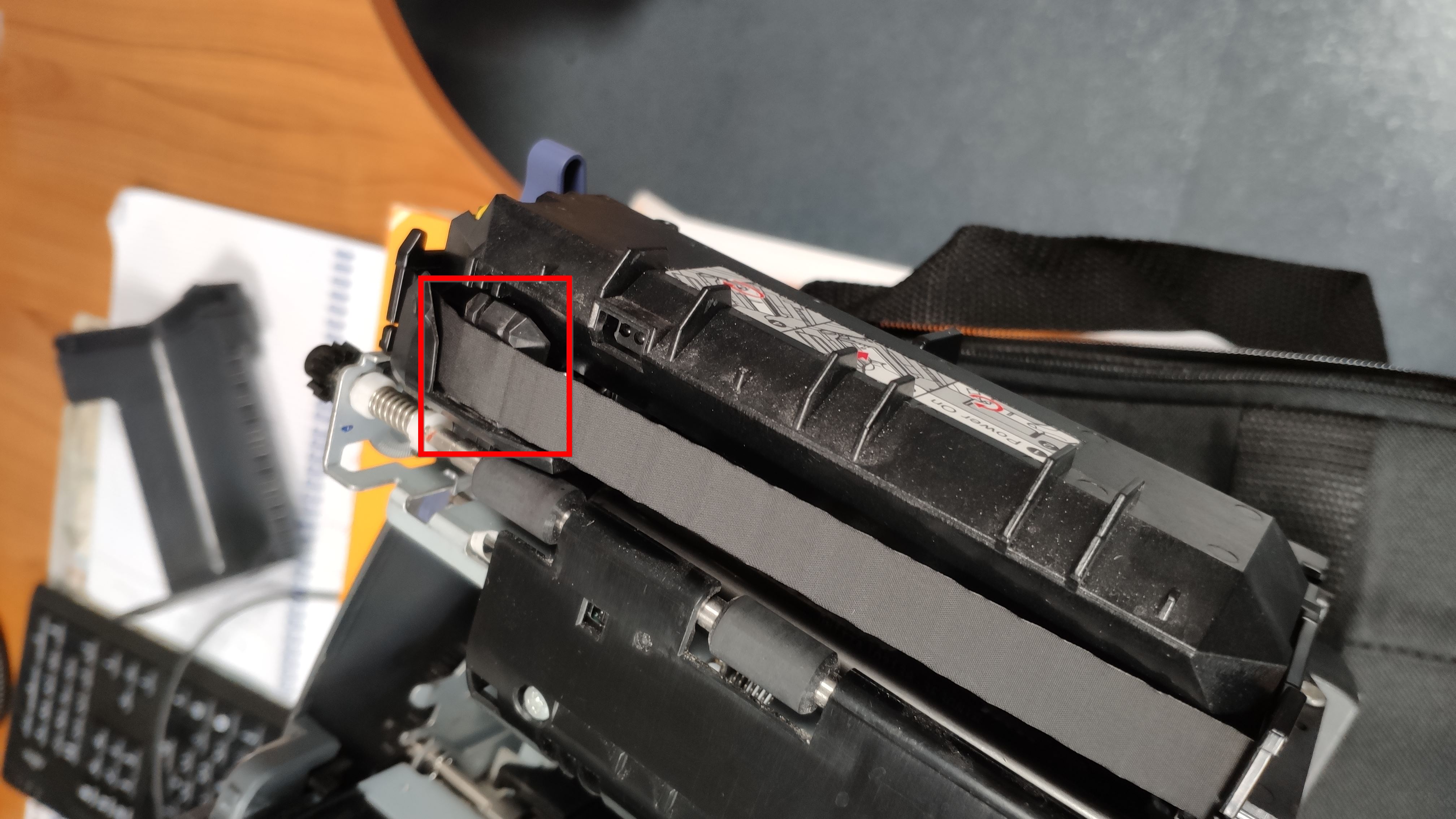 Photo de la tête d'impression avec MAUVAIS placement du ruban :