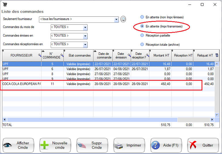 choisissez dans la fenêtre votre commande fournisseur direct à receptionner: (elle sera en statut en attente Impirmée/transmise)