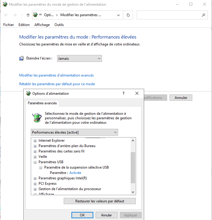 Se rendre également dans les options avancés du menu “gestion de l'alimentation” de Windows. Vérifier dans l'onglet “Paramètres USB” ⇒ “Paramètre de la suspension sélective USB”, que le paramètres soit configuré en Désactivée