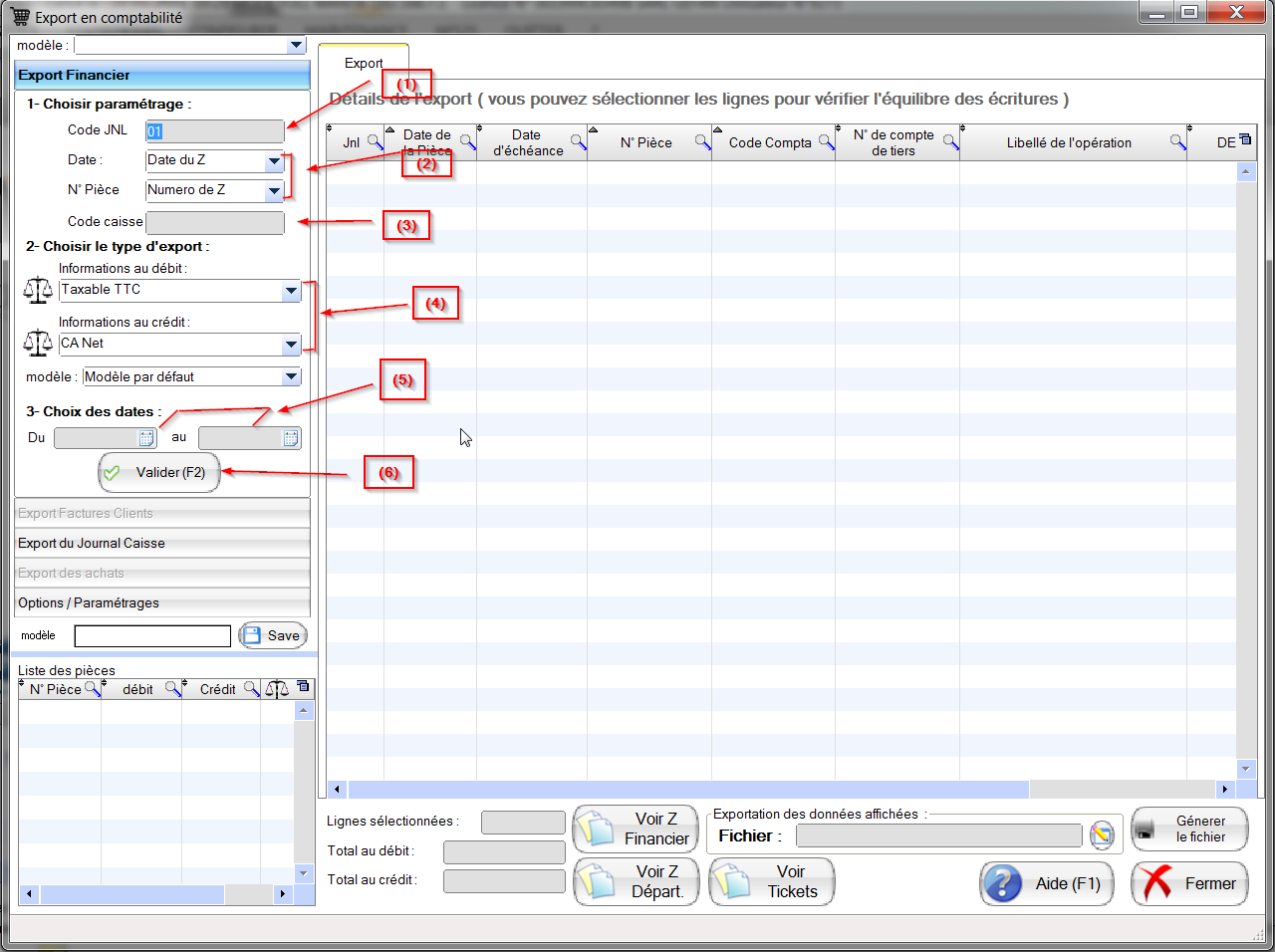(1) Cliquez sur ces boutons afin de consulter le “Z financier”, le “Z par Département” ou encore les “tickets” liés à votre recherche.