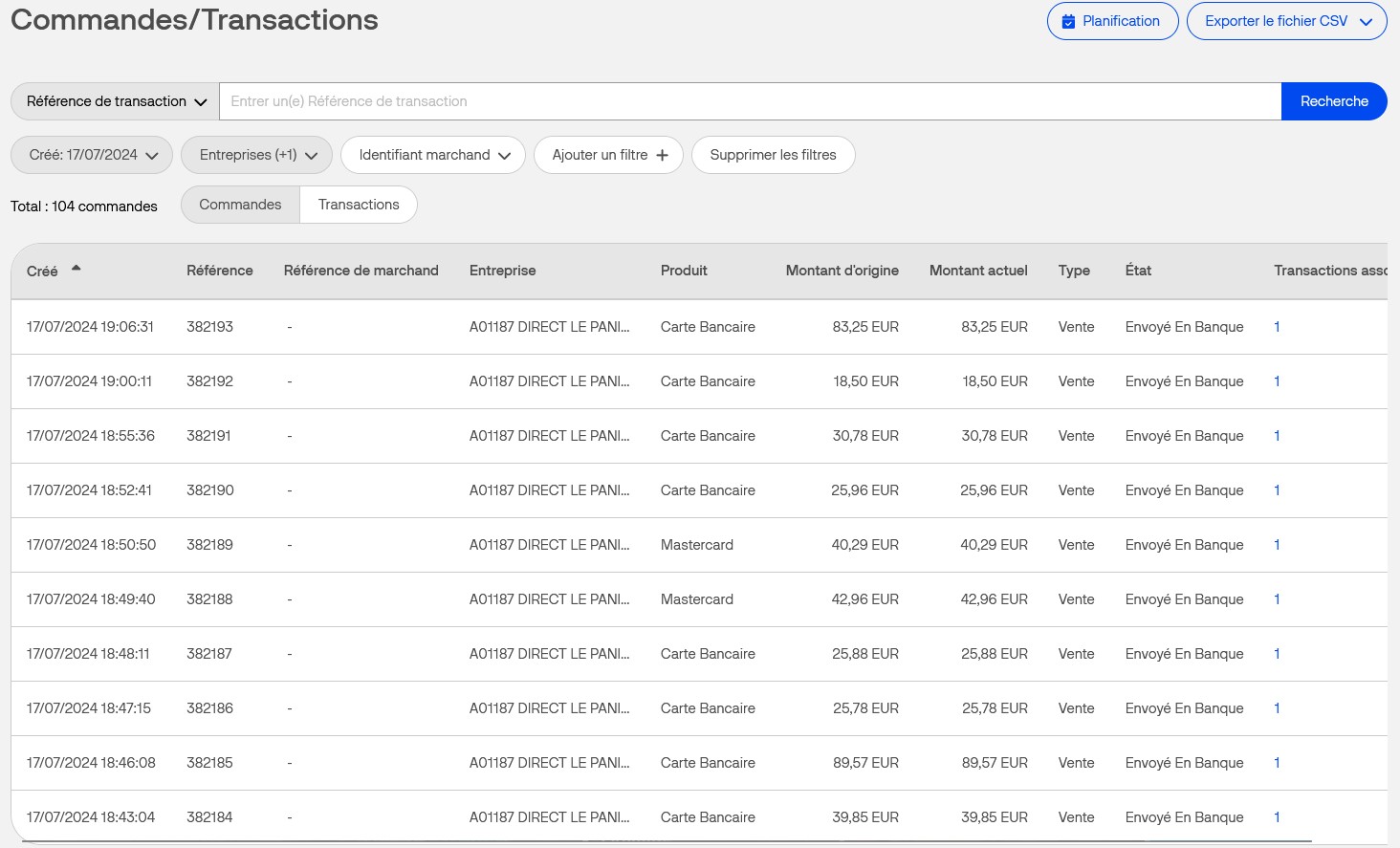 - Dans l'exemple du journal, nous pouvons consulter les transactions bancaires. Survoler l'ontglet “Commerce”, cliquer sur “Transactions” et choisir une date.