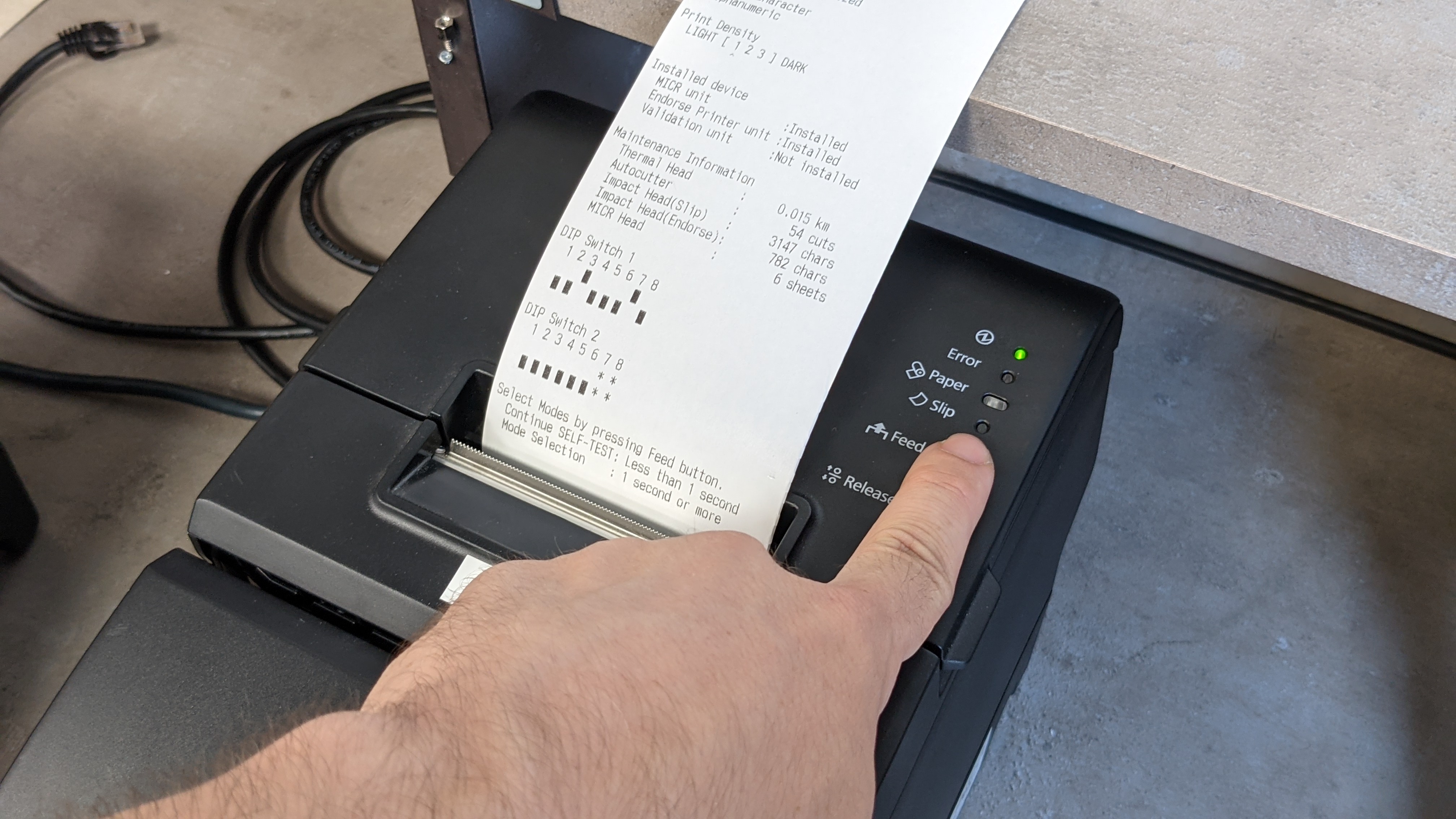 - Un deuxième papier sort : c'est soit la fin du test FEED SOIT la première page de configuration, si vous avez le premier cas rester appuyer sur le bouton FEED afin d'arriver à la première page de configuration.