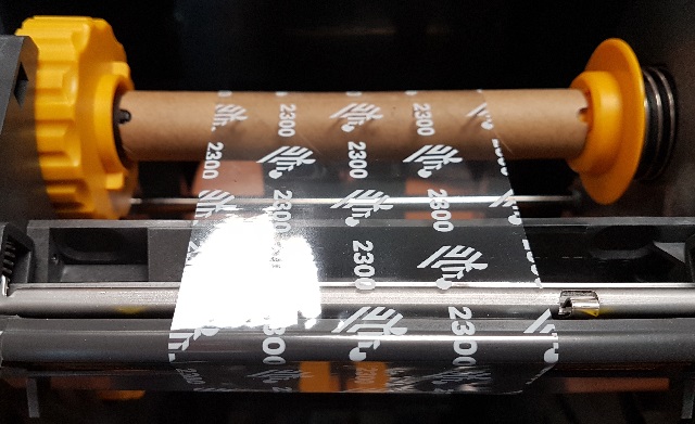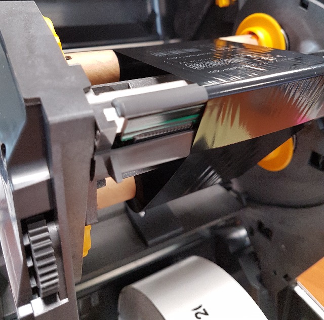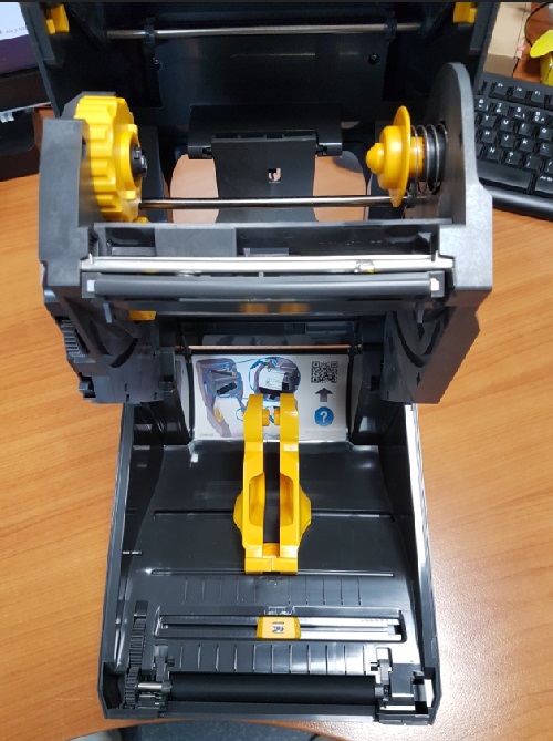 5. Pour changer le consommable cartonné ou autocollant, écartez les 2 plaques jaunes au bas de l'imprimante et enserrez le rouleau de consommable comme sur la photo ci-dessous