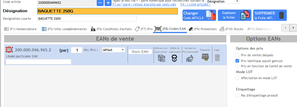 - Un code EAN de vente (dans la plupart des cas identique au cas article)