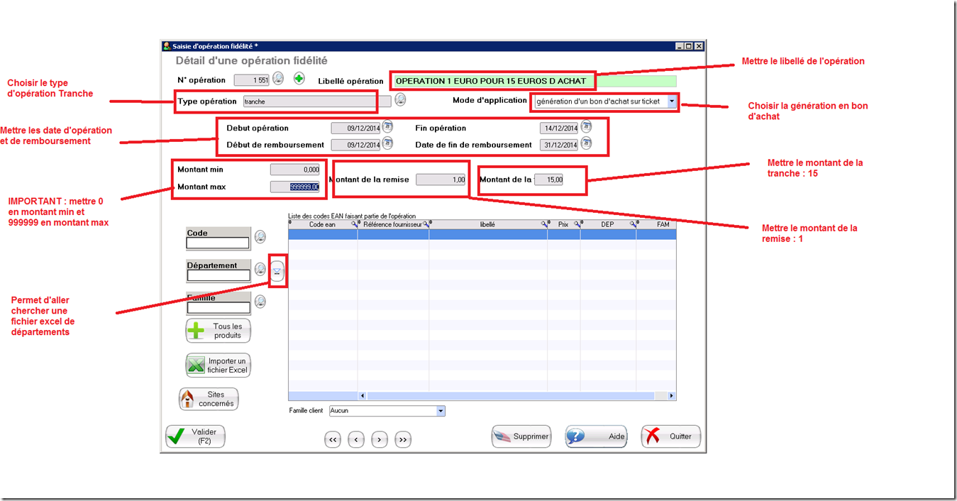 Selon l'opération il est possible d'affecter un code EAN, une famille, un département ou tout les produits.