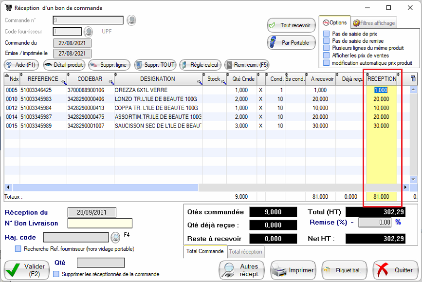Vous ainsi renseigner les quantités réellement reçues (Cadre rouge) pour chaque ligne.