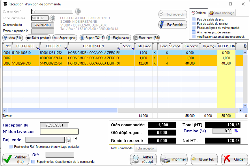 saisissez ensuite les articles (ou l'article générique de valorisation avec le PA et le PV) et validez les quantités et les montants une fois la saisie terminées. :!: Notez que ces produits sont anotés en “HORS CMDE''