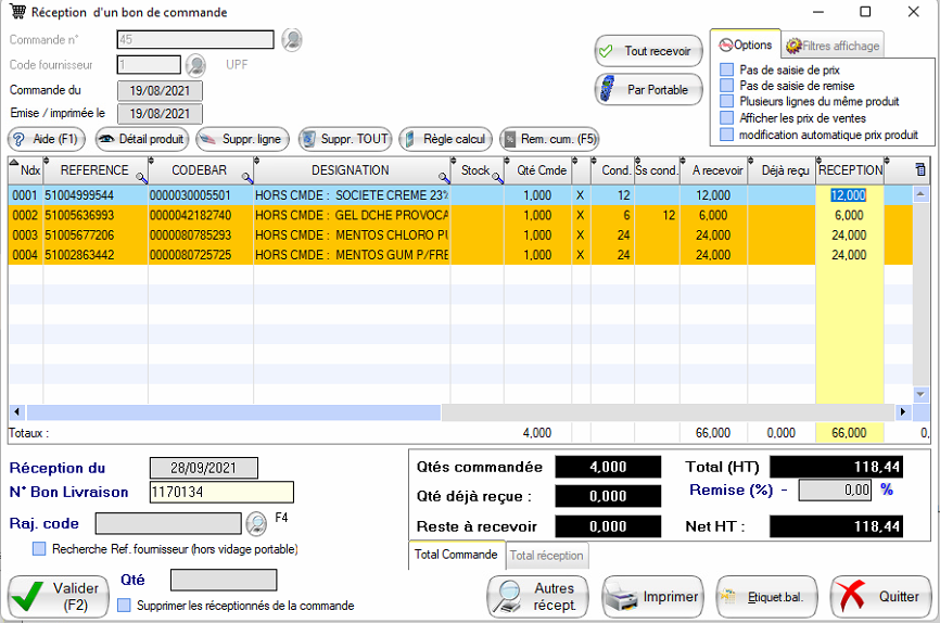 cliquez sur le bouton “RECEPTIONNER CMDE” pour ouvrir la fenêtre de la liste des commandes: