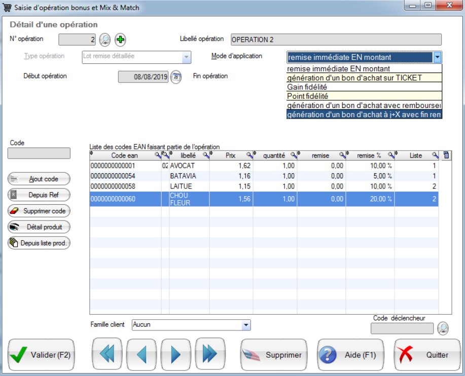 Selon l'opération il est possible d'affecter un code EAN, une famille, un département ou tous les produits.