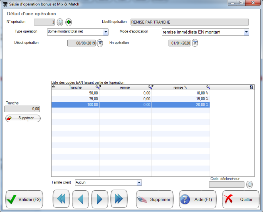 Cette opération est simple à mettre en place, ce sont des remises par tranche de montant atteints en caisse, on peut par exemple dire que si le ticket du client atteint un certain montant, il aura tant de remise %, on peut mettre plusieurs tranches voir détail.