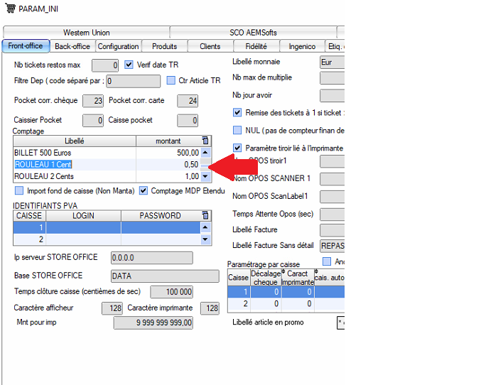 Si le client demande de pouvoir rajouter des rouleaux de monnaie lors d'un comptage caisse et que cela n'est pas configuré/proposé dans le logiciel, il faudra se rendre dans le super mot de passe de STOE POS, dans l'onglet “Front Office”.