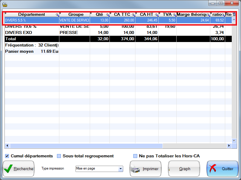 Pour le département « DIVERS 5.5% » vous avez « 260.00 CA TTC »