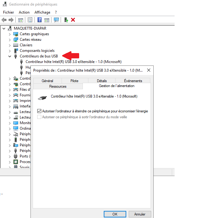 Dans Windows : Il faut se rendre dans “gestionnaire de périphériques”, puis dans les “contrôleurs de bus USB”, aller dans les “propriétés” de chaque port USB et vérifier dans l'onglet “Gestion de l'alimentation” que la ligné “Autoriser l'ordinateur à éteindre ce périphérique pour économiser l'énergie” ne soit pas cocher.