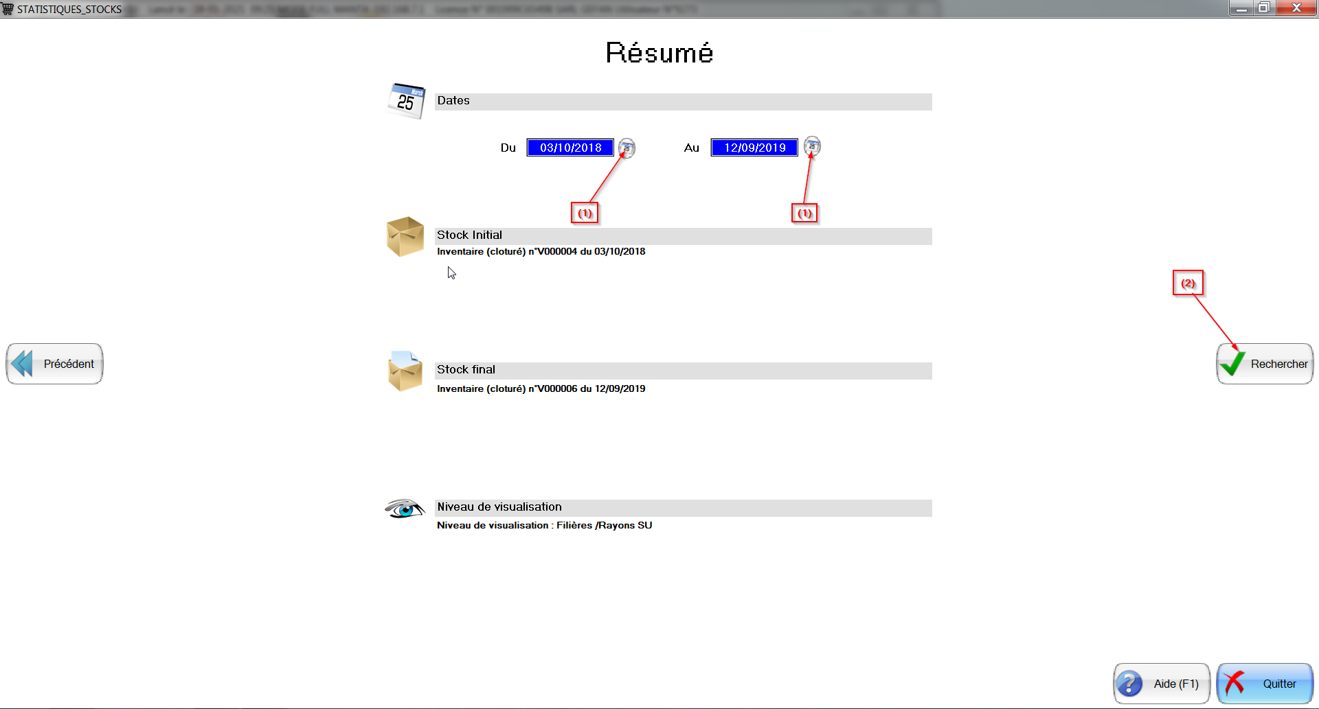 (1) : Vous pouvez en cliquant sur les icônes de calendriers choisir la période de ventes à comparer. Par défaut elle sera établie entre la date du stock initial et celle du stock final.