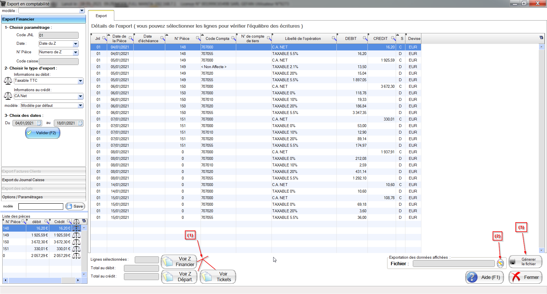 ACCES : Il est possible de créer depuis le logiciel Store-Pos via le le module “Export Comptabilité”, un fichier qui regroupe les écritures comptables générées par les données financières.