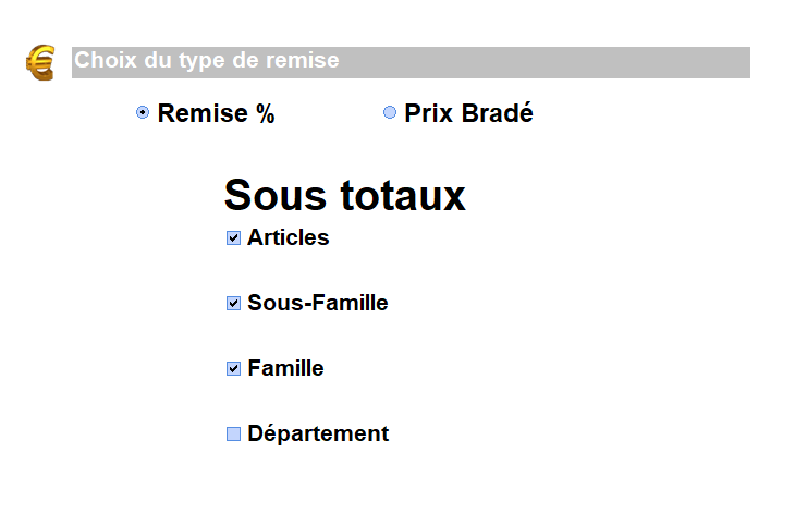 Un menu s’affichera dans lequel vous pourrez choisir le type de remise souhaité :