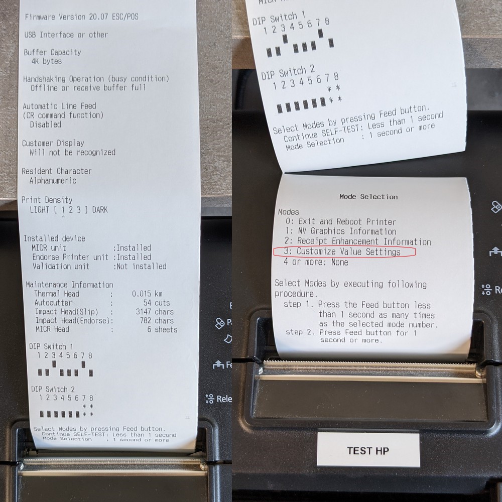 - Un deuxième papier sort : c'est soit la fin du test FEED SOIT la première page de configuration, si vous avez le premier cas rester appuyer sur le bouton FEED afin d'arriver à la première page de configuration.